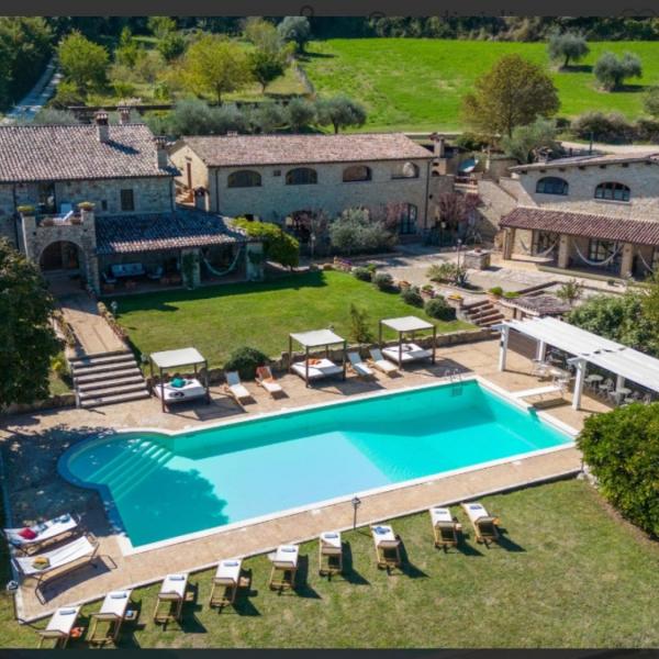 Situato tra Todi e Perugia, nei pressi del caratteristico villaggio medievale di Collazzone, questo casale di ca. 320 mq (285 mq calpestabili) gode di uno splendido panorama. Ristrutturato nel 2004, mantiene intatta la piacevole struttura originale con camini in pietra, archi e antiche travi in legno.